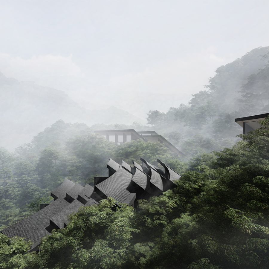 都江堰森林景区酒店项目探讨林地中建筑的存在状态和因自然而形的设计逻辑。项目处于待建状态,由建筑师郑东贤带领团队于2019-2020年完成建筑、室内、场地设计方案。