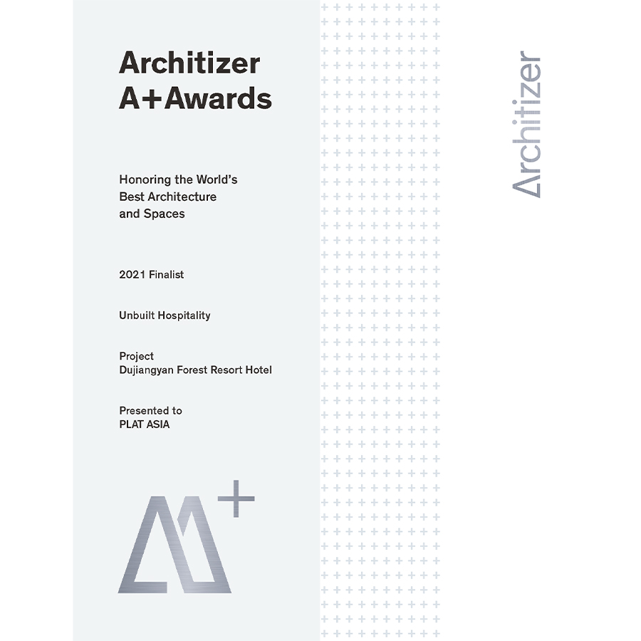 PLAT ASIA于2020年完成的都江堰森林景区酒店项目获得2021 Architizer A+Awards 未建度假项目类全球五个终决选项目之一。A+Awards 由全球建筑行业影响力最广泛的综合网站之一Architizer主办, 2021第九届大奖由来自全球4000多个参选项目共同角逐出94个类别共300多个终选作品,历届获奖者囊括国际知名事务所的设计作品。